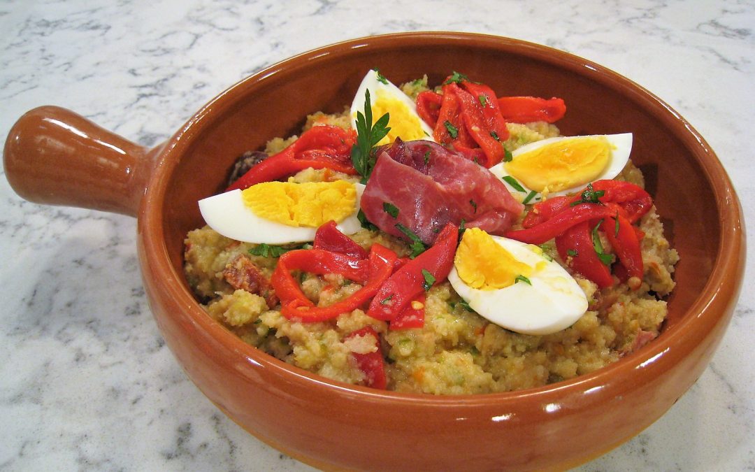 Cortar el pimiento verde y el pimiento rojo en daditos, depositándolos en un cuenco grande junto con los dientes de ajo y un pellizco de sal. Comenzar a majar con el mortero durante unos 10 minutos, hasta que tengamos todos los ingredientes bien majaos como un puré. Quitar el pedúnculo o tallo a los tomates, hacerles un corte en cruz en la base y sumergirlos en agua hirviendo durante unos 30 segundos. Apartar del agua y reservar sin enfriar. Picar los tomates con el cuchillo y agregarlos al cuenco. Echar un chorro generoso de virgen extra y continuar aplastando con la maza del mortero hasta que se deshaga bien el tomate. Retirar la corteza más gruesa del pan y cortarlo a pellizcos. Agregarlo en el cuenco y seguir majando hasta que se deshaga. Incorporar 2 o 3 cazos de agua caliente de cocción del tomate y continuar removiendo hasta formar la masa definitiva del ajo campero o ajo caliente. Agregar el chorizo cortado en daditos, remover y presentar en una cazuela con huevo cocido por encima, jamón picado, tiras de piquillo y perejil picado.