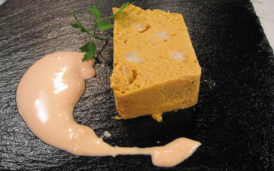 Disponer los lomos de merluza en una cacerola con medio dedo de agua. Dejar cocer a fuego fuerte entre 3 y 4 minutos. Dorar las cáscaras de las gambas en una sartén con aceite de oliva virgen extra. Apartar y desechar. Picar el blanco del puerro, la zanahoria y la berenjena pelada; comenzando a rehogarlos en el aceite anterior durante unos minutos. Mientras tanto, apartar el pescado del agua, quitarles la piel, las espinas y desmenuzarlo. Agregar la nata y nada más que comience a hervir retiramos del fuego y agregamos el tomate y el pescado desmenuzado. Retiramos del fuego. Triturar bien la mezcla con ayuda de una batidora. Batir los huevos en un cuenco y verter la mezcla triturada. Añadir los cuerpos troceados de las gambas, mezclar bien, salpimentar y disponer sobre un molde de horno cubierto con plástico film. Hornear al baño María, en el horno precalentado a 170º C., durante 45 minutos. Para la salsa rosa mezclar la mahonesa con el Ketchup. Incorporar el zumo de ½ naranja, 2 cucharadas de Brandy de Jerez y un poco de salsa Perrins. Mezclar todo bien y reservar al frío. Pinchar el pastel para comprobar que está bien cocinado, apartarlo y dejarlo enfriar antes de guardarlo al frío.