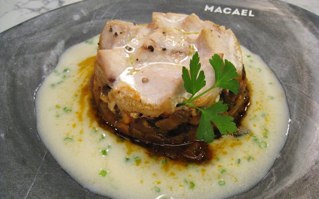 En primer lugar dorar las cabezas y caparazones de las cáscaras en una sartén con 5 cucharadas de virgen extra. Apartar y desechar. En el mismo aceite anterior comenzaremos a sofreír 1 cebolla, los dientes de ajo, el calabacín y la berenjena pelada; todo cortado en pequeños dados. Dejaremos sofreír 20 minutos a fuego medio. Apartar el sofrito del fuego y disponer en un cuenco. Incorporar los cuerpos troceados de las gambas, 2-3 cucharadas generosas de tomate frito, mezclar bien y probar de sal. Reservar al frío. Para la salsa de cava sofreír una cebolla picada y verter 1 vaso de espumoso andaluz. Dejar que reduzca un poco y agregar medio vaso de nata. Salpimentar y cocinar cinco minutos a fuego medio. Disponer un molde circular engrasado en la bandeja del horno cubierta con papel vegetal. Colocar el sofrito de verduras en la base y pequeñas porciones de pez espada encima. Salpimentar y rociar con un poco de virgen extra. Cocinar en el horno precalentado a 185º unos 10 minutos aproximadamente. Para terminar la salsa, la trituraremos, la colaremos y la reservaremos; añadiéndole entonces un poco de cebollino picado.