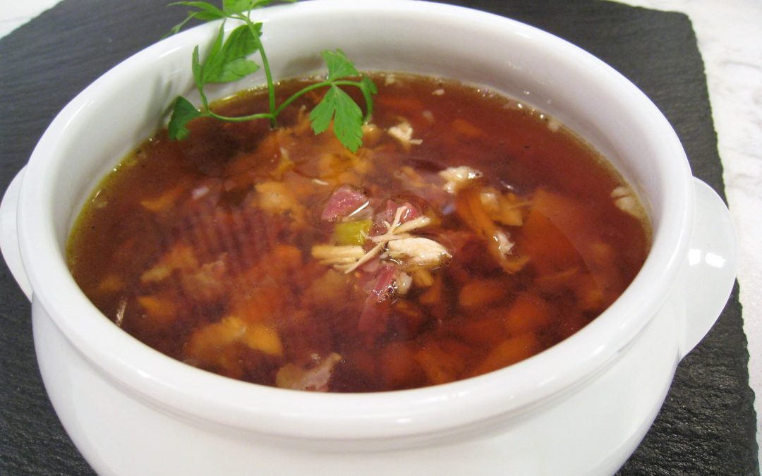 Lo primero que haremos para nuestro consomé será cortar una cebolla en rodajas y disponerlas en una sartén al fuego con unas gotas de virgen extra. La mantendremos al fuego hasta que se quemen y se pongan negras. Por otro lado, introducir los muslos sin piel junto con la carcasa del pollo en agua hirviendo. Nada más vuelva a hervir el agua los retiramos y lo enfriamos en agua con hielo. Reservar los muslos. Por otro lado, meter la carcasa al horno con 1 chorrito de virgen extra y la cebolla que teníamos al fuego. Hornear a 210º C hasta que los huesos del pollo estén bien dorados. Para la guarnición comenzaremos a sofreír en una sartén con un poco de virgen extra 1 cebolla, 1 puerro, 1/4 de col, 1 zanahoria y las setas; todo cortado en pequeños dados. Salpimentar y cocinar 20 minutos a fuego medio. Disponer el caparazón tostado en una cacerola con los muslos de pollo y un puñado de sal. Cubrir con agua fría e introducir las rodajas quemadas de cebolla. Hacer un bouquet garní con la capa exterior del puerro, la zanahoria, laurel y tomillo. Lavarlo bien bajo el grifo y agregarlo al consomé. Dejar hervir suavemente 1 hora. Pasado este tiempo lo colaremos, desmigaremos los muslos de pollo y los añadiremos a la guarnición junto con el jamón picado.