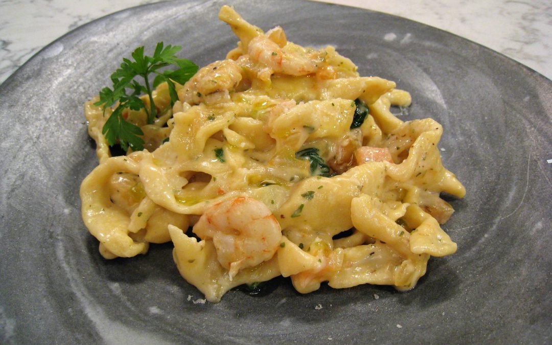 Para hacer la masa de pasta fresca, tamizaremos la harina, daremos forma de volcán, añadiremos un pellizco de sal y 2 huevos batidos. Comenzaremos a mezclar poco a poco con un tenedor, para terminar amasando con las manos. Una vez que la masa sea homogénea, espolvorear con harina, envolver con plástico y dejar reposar en la nevera 1 hora. Cortar pequeñas porciones de masa y estirarlas con el rodillo, ayudándonos de harina, hasta que esté bien fina. Cortar tiras, espolvorear con harina y hacer pequeños nidos. Dorar las cabezas y cáscaras de las gambas en una cacerola con un chorreón generoso de virgen extra. Apartar y desechar. En ese mismo aceite comenzaremos a sofreír la cebolla y 4 dientes de ajo picados. Incorporaremos las espinacas limpias y los cuerpos de las gambas. Salpimentar ligeramente, cocinar unos minutos y retirar de la cacerola. Verter en la cacerola anterior 1 vaso de leche y 1 vaso de caldo de ave. Nada más que comience a hervir introduciremos los espaguetis frescos y los coceremos, a fuego fuerte, sin parar de mover; añadiendo un poco de agua si fuera necesario. Justo cuando la pasta está casi en su punto de cocción deseado, devolveremos las gambas con las verduras y añadiremos además una pizca de orégano, queso rallado y un tomate RAF cortado en pequeños dados. Mezclar bien y servir.