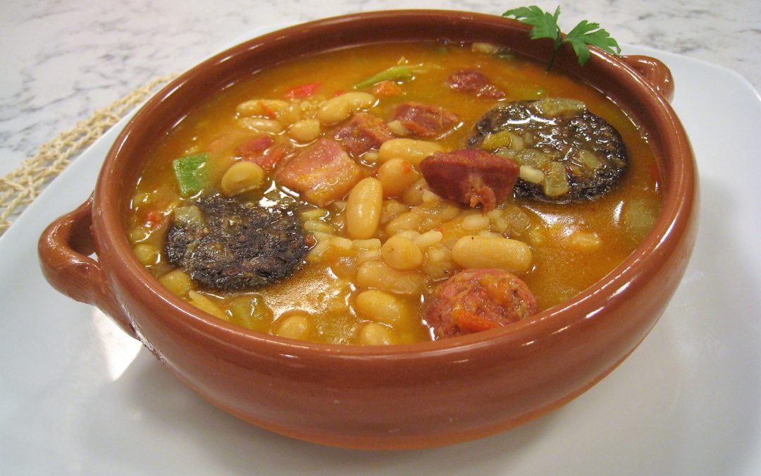 Poner las alubias en remojo la noche anterior. Picar las cebollas y comenzar a rehogar en virgen extra con los ajos laminados, una hoja de laurel, el pimiento rojo troceado y las hebras de azafrán. Añadir el puerro cortado en rodajas y la calabaza. Sofreír, agregar los tomates picados en dados y remover bien. Incorporar entonces las alubias escurridas, cubrir con agua fría, añadir un poco de sal y dejar cocer unos 40 minutos, hasta que estén tiernas. Pelar las patatas, lavarlas y añadirlas al guiso troceadas junto con las judías verdes limpias de hebras y cortadas en pequeñas porciones. Por otro lado, picar el bacon y comenzar a dorarlo a fuego fuerte en una sartén con un poco de virgen extra. Agregar el chorizo y la morcilla troceados. Dejar cocinar unos minutos. Escurrir un poco la grasa de la sartén y verter el contenido de esta sobre las alubias que tenemos cocinando al fuego. Incorporar 1 vaso colmado de arroz, probar de sal y dejar cocinar unos 15 minutos, hasta que el arroz empiece a estar en su punto.
