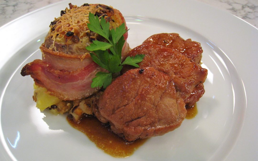 Disponer 4 patatas en una fuente y asarlas en el horno precalentado a 175º durante unos 40 minutos, hasta que las pinchemos y estén tiernas. Apartar entonces y dejar que pierdan temperatura. Mientras se asan las patatas, comenzaremos a sofreír en una sartén con virgen extra la cebolla, los dientes de ajo, la berenjena pelada y la calabaza; todo picado en pequeños dados. Salpimentar y dejar que se cocinen bien. Cuando las verduras estén bien sofritas, las apartaremos en un cuenco y agregaremos casi todo el queso cortado en pequeñas porciones. Cortar un extremo de las patatas a modo de tapadera. Vaciarlas con ayuda de una cuchara, procurando que no se partan o quiebren y rellenarlas con la mezcla anterior de verduras y queso. Envolver cada patata con lonchas de bacón, fijando con ayuda de palillos de dientes si fuera necesario. Rallar el resto del queso por encima y cocinar durante 15 minutos en el horno precalentado a 195º. Finalmente cocinaremos la carne. Cortaremos el solomillo en filetes gruesos y los doraremos en una sartén, a fuego fuerte, con un poco de virgen extra. Cuando estén dorados por fuera y crudos por dentro, los salpimentaremos y añadiremos 1/2 vaso de vino de naranja y 1/2 de caldo de carne. Dejaremos que la carne se termine de cocinar y la salsa espese al reducir. Servir las porciones de solomillo con salsa por encima y acompañadas de la patata rellena.