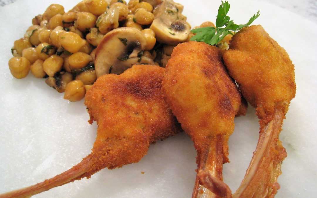 Cocinar brevemente a fuego fuerte, en una sartén con aceite de oliva virgen extra, las chuletillas; debiendo quedar poco hechas. Apartar, salpimentar y reservar sobre papel para que escurran. En la misma sartén, hacer una bechamel, rehogando 2 dientes de ajos picados. Añadir 100 g. de harina y cocinar un par de minutos si parar de mover. Verter entonces poco a poco la leche, una pizca de comino molido, tomillo seco y salpimentar. Dejar que hierva, mantener unos minutos al fuego y retirar del calor. Coger las chuletillas por la parte final del hueso e introducirlas dentro de la bechamel hasta que la carne de éstas esté bien cubierta. Disponer sobre una fuente engrasada con aceite de oliva y reservar al frío. Como guarnición comenzaremos a saltear, fuego fuerte, en una sartén con virgen extra los champiñones cortados en cuartos. Incorporar la cebolleta picada, los garbanzos escurridos, perejil picado, sal y pimienta. Cocinar a fuego fuerte hasta que esté todo bien dorado. En ese momento verteremos sobre los garbanzos 1/2 vaso de vino blanco. Bajaremos a fuego medio y mantendremos al calor hasta que se evapore el líquido. Una vez que están bien frías las chuletillas, las empanamos; pasándolas por huevo batido y pan rallado. Freímos en virgen extra y apartamos sobre papel de cocina para escurrir. Presentar las chuletillas empanadas junto con el salteado de garbanzos.