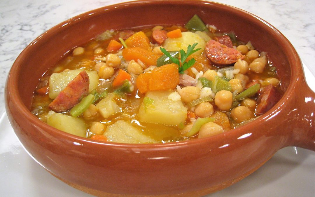 Comenzar a freír en una cacerola con virgen extra el hinojo cortado en finas láminas junto con la cebolla, los dientes de ajo, las zanahorias y el pimiento verde; todo cortado en pequeños dados. Dejaremos que se rehoge bien. Cuando la verdura esté bien rehogada cubriremos con agua y añadiremos el muslo de pollo, el chorizo, el tocino y 2 clavos. Limpiar las judías verdes, retirando las hebras laterales y las puntas. Cortarlas en pequeñas porciones y agregarlas a la cacerola junto con la calabaza y las patatas partidas en trozos generosos. Nada más que esté tibia o caliente el agua de la cacerola incorporaremos los garbanzos que hemos tenido la víspera en remojo con agua caliente. Dejaremos cocer primero a fuego fuerte, desespumando, y luego a fuego medio, hasta que los garbanzos comiencen a estar tiernos. Por último, y con los garbanzos ya en su punto, probar de sal y agregar el arroz. Dejar que se cueza a fuego medio. Mientras se cuece, sacaremos el muslo de pollo, el tocino y el chorizo del guiso. Retiraremos los huesos, trocearemos y lo devolveremos a la cacerola.
