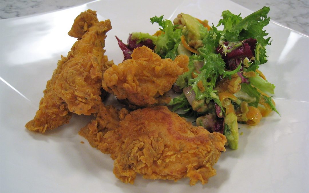 Echar en el cuenco un buen puñado de sal, pimienta, 3 dientes de ajo, 2 cucharadas de pimentón dulce, 1 cucharadita de pimentón picante, 1 cucharada de curry y 1 de orégano. Agregar 2 tazas de harina, la leche y batir bien hasta conseguir una mezcla homogénea y espesa. Cortar las pechugas de pollo en trozos generosos, introducirlos en la mezcla anterior, cubrir con plástico y guardar en el frigorífico durante unas 2 horas. Para la ensalada disponer en la base de un cuenco 5 cucharadas de virgen extra, 2 cucharadas de vinagre, 1 cucharada de mostaza y 1 de miel. Salpimentar y mezclar bien. Encima de la vinagreta añadiremos taquitos de queso, de jamón cocido, nueces peladas, 1 cebolleta cortada en juliana, 1 zanahoria, 1 aguacate troceados y la lechuga. No mezclaremos hasta el momento justo de servir. Por último, mezclar las 2 tazas de harina restante con 1 cucharada colmada de pimentón dulce. Escurrir el pollo de la marinada, pasarlo por la harina y freírlo en aceite de oliva virgen extra. Apartar sobre papel de cocina.