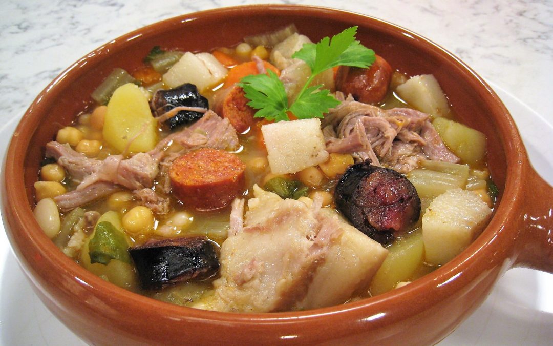Disponer en una cacerola grande la cabeza de lomo, el tocino, la papada, las manitas de cerdo y las alubias blancas que hemos tenido en remojo la noche anterior. Cubrir con agua y llevar al fuego. Quitar las hebras del apio y las acelgas. Picarlos y añadirlos al guiso. Cuando el agua de la cacerola deje de estar fría incorporar los garbanzos que habremos puesto en la víspera remojados en agua caliente. Dejaremos hervir unos 45 minutos aproximadamente, desespumando a menudo, a fuego medio. Haremos un “majao” disponiendo en el mortero un buen puñado de sal y los dientes de ajo troceados. Majar hasta que tengamos una pasta y agregar una cucharada de virgen extra, otra de pimentón dulce, 3 clavos y media cucharada de comino. Continuar aplastando con la maza del mortero, desleír con un poco de caldo de la cacerola y verter el “majao” sobre la cacerola. Como truco opcional, verter en la cacerola 1 cucharada generosa de manteca “colorá”. Añadir a la cacerola el chorizo y la morcilla. Por otro lado, pelar las patatas y las zanahorias. Cortarlas en trozos generosos y agregarlos al guiso. Dejaremos cocer hasta que las legumbres y las carnes estén tiernas. Sacar la “pringá” de la cacerola, trocearla y disponerla en una fuente para servir junto con la berza jerezana.