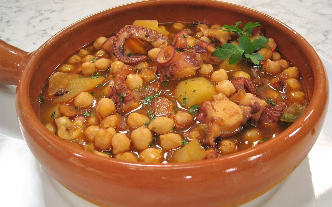 Poner una cacerola con agua a hervir: Una vez que comience a hervir introduciremos los garbanzos que hemos tenido en la víspera remojados en agua caliente. Lavar bien el pulpo bajo el grifo. Quitarle la boca y sumergirlo en el agua hirviendo, cogido por la cabeza, y sacarlo del agua. Repetir esta operación tres veces y después dejarlo cocer durante unos 30 minutos. Por otro lado, trocear las cebollas en dados y comenzar a rehogarla junto con los dientes de ajo, las zanahorias, los pimientos cortados en dados y una hoja de laurel. Dejar rehogar unos minutos. Incorporar a las verduras una cucharada de pimentón dulce y a continuación los tomates picados. Dejamos sofreír hasta que el tomate este bien cocinado. Verter entonces 1 vaso de vino del Condado y dejar que hierva unos segundos. Añadir las patatas cortadas en cachelos pequeños y 1/2 cucharada de comino molido. Comprobar que el pulpo esta tierno y retirarlo para que enfríe un poco. Trocear el pulpo con ayuda de unas tijeras y añadirlo a las verduras. Sofreír brevemente y agregar los garbanzos escurridos y el agua de cocción del pulpo; solo la necesaria para que cubra. Ajustar de sal y dejar cocer hasta que la patata y los garbanzos estén tiernos. Antes de servir espolvorear con abundante perejil picado.