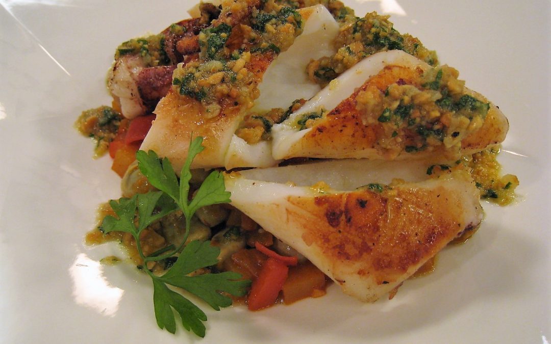 En primer lugar dorar 3 dientes de ajo en una sartén con 3 cucharadas de aceite de oliva virgen extra. Cuando tengan color lo apartaremos todo en un mortero, añadiremos un poco de sal, algunas almendras fritas, unas 3 cucharadas más de virgen extra, un poco de jugo de limón y perejil picado. Majar bien hasta obtener una mezcla ligeramente espesa. Por otro lado limpiar los calamares, retirando la telilla que los recubre y dándoles la vuelta a los cuerpos, para que la parte interior quede hacia afuera y queden bien limpios. Hacer unos cortes en cruz con el cuchillo sobre estos y reservar. Como guarnición comenzaremos a sofreír en una sartén con aceite la cebolla y el pimiento rojo. Agregar 1/2 cucharada de pimentón, los tomates troceados, las habas desgranadas y las patatas cortadas en daditos. Dejaremos sofreír unos minutos. Pasado este tiempo añadiremos 1vaso de vino blanco y dejaremos que se evapore. Salpimentar y dejar cocinar hasta que la patata esté tierna y las habas cocinadas; agregando algo de agua o más vino si fuera necesario. Solo nos restará cocinar los calamares a fuego fuerte en otra sartén con 3 cucharadas de virgen extra. Dejar que se dore bien por un lado y dar la vuelta. Una vez que estén bien dorados los calamares le añadiremos un poco del “majao” reservado por encima.