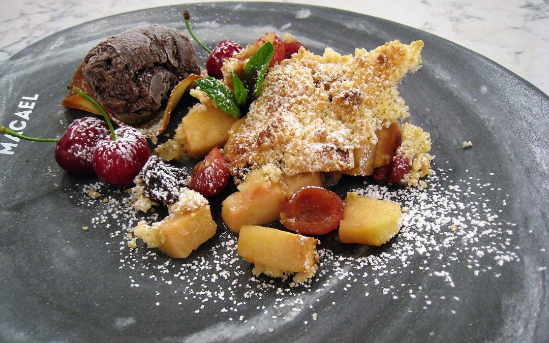 Poner las pasas en remojo con el ron. Para la masa de las tulipas: mezclar bien en un cuenco 60 g. de harina, 2 claras de huevo, 60 g. de azúcar y 60 g. de mantequilla tierna. Una vez que la masa sea homogénea, reservaremos al frío para que coja algo de cuerpo la masa. Por otro lado comenzaremos a quitar los huesos a las cerezas. Pelar las manzanas, cortarlas en dados y mezclarlas en una fuente de horno con las cerezas deshuesadas. Verter por encima las pasas con el ron y espolvorear con canela molida. Por otro lado mezclar la harina con el azúcar y la mantequilla ablandada. Unir y mezclar con los dedos. Repartir la mezcla anterior por encima de las manzanas y cerezas. Hornear durante 30 minutos en el horno precalentado a 185º C. Sacar la masa de tulipas de la nevera, extender finas capas sobre papel vegetal y dejar que se doren en el horno a 185º C. Retirar las tulipas del horno y, antes que se enfríen, colocarlas sobre la base de una taza y presionarlas suavemente para que adquieran dicha forma. Presentar una porción de Crumble con la tulipa al lado y helado de chocolate. Decorar, de forma opcional, con algunas cerezas y azúcar glasé.