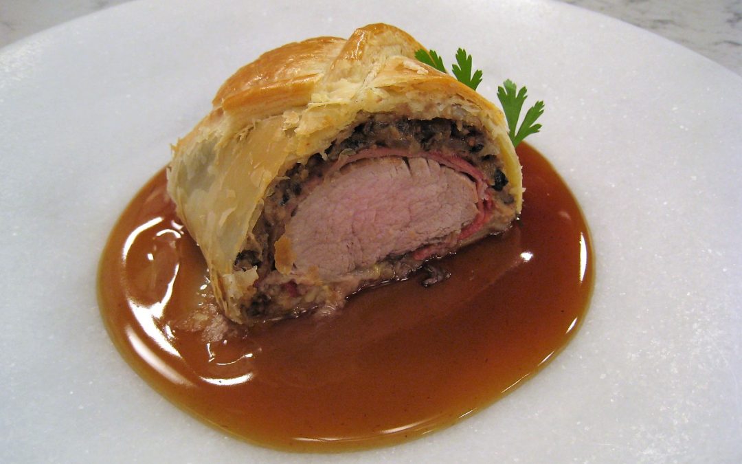 En primer lugar limpiar los solomillos de exceso de grasa y dorarlos por todos lados en una sartén caliente con un poco de virgen extra. La carne debe quedar poco hecha o cruda en el interior. Apartar y dejar enfriar en la nevera sobre papel de cocina. Picar la cebolla y comenzar a sofreírla en la sartén anterior junto con el diente de ajo y los champiñones bien picados. Salpimentar ligeramente y dejar cocinar 10 minutos a fuego medio-alto. Una vez tengamos los champiñones bien rehogados, verteremos el contenido de la sartén en un cuenco y mezclaremos con el paté de cerdo. Reservaremos también al frío hasta el momento de utilizarlo. Para los crepes; Introducir en una jarra la harina, la leche, 1 huevo, un pellizco de sal, un chorrito de virgen extra y terminar de batir. Añadir un poco de virgen extra a una sartén e incorporar un cacito sopero de masa de crepes. Extender por toda la superficie y, cuando le salgan pompitas, le damos la vuelta. Dejar cocinar brevemente y apartar. Solo nos resta montar los solomillos wellington. Para ellos extenderemos el hojaldre y sobre este colocaremos 2 crepes, sobrepuesto uno encima de otro. Sobre las crepes untaremos la mezcla de verduras con paté reservadas. Sobre esta mezcla extenderemos lonchas de jamón, unas montadas sobre otras. Salpimentar el solomillo, untarlo con un poco de mostaza y colocarlo sobre el jamón. Envolverlo con el jamón primero, envolverlo con los crepes después y finalmente con el hojaldre. El hojaldre sobrante podemos emplearlo en hacer pequeños tiras y disponerlas sobre el bloque de hojaldre. Pintar todo con huevo batido y hornear a 180º durante 20 minutos. Es recomendable dejar reposar la carne unos minutos antes de cortarla. Podemos servir la carne con la guarnición o la salsa que más nos guste.