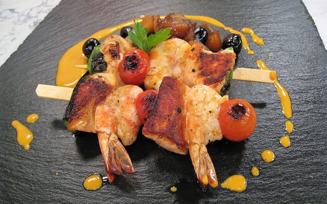 Pelar los langostinos, dejándoles solo la parte final de la cola sin pelar, y reservarlos al frío. Tostar las cabezas y caparazones de los langostinos en una cacerola con aceite de oliva virgen extra. Una vez doraras, las apartaremos y reservaremos en una jarra. Añadir los tomates troceados, triturar bien y colar. Para la guarnición disponer en una cacerola 3 manzanas peladas y troceadas en pequeños dados, 1 cebolla picada, 150 g. de azúcar de caña, el zumo de 1 naranja, un chorreón generoso de vinagre, 1 cucharilla de canela molida, un poco de nuez moscada, 4 clavos un poco aplastados y 75 g. de aceitunas negras sin hueso picadas ligeramente. Disponer a fuego medio y dejar cocer 35 minutos; hasta que adquiera una consistencia más espesa. Reservar. Para las brochetas cortaremos el salmón, sin piel ni espinas, el dados. Intercalaremos dados de salmón con los langostinos reservados, porciones de pimiento verde y tomate cherry. Salpimentar y cocinar en una sartén con un poquito de virgen extra, a fuego alto, y dándole el punto de cocción deseado al pescado. Servir las brochetas sobre el chutney de aceitunas y acompañar con un poco de salsa de langostinos.