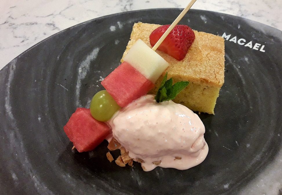 Para el bizcocho, disponer en un cuenco el azúcar, la vainilla, el virgen extra y los huevos. Comenzar a mezclar con la varilla. Añadir la harina y la levadura tamizadas y mezclar hasta que quede una masa densa y homogénea. Verter en un molde engrasado y forrado con papel vegetal, espolvorear con azúcar y cocinar, en el horno precalentado a 170ºC, durante unos 35 minutos aproximadamente. Para el helado, triturar bien la pulpa de la sandía hasta que quede bien líquida. Por otro lado, y en un cuenco que hemos guardado previamente en el congelador, comenzar a montar la varilla la nata bien fría y agregar, poco a poco, el azúcar glasé. Cuando comience a montarse, verter el jugo de la sandía sin parar de mover. Cubrir y guardar, durante dos horas, en el congelador. Pasado este tiempo, sacar del frío, volver a mezclar con la varilla de mano y llevar de nuevo, bien cubierto, al congelador. Repetir este proceso hasta obtener la consistencia deseada. Finalmente, sacar el bizcocho del horno, dejar reposar unos 10 minutos y comenzar a preparar la fruta para elaborar unas ricas brochetas.