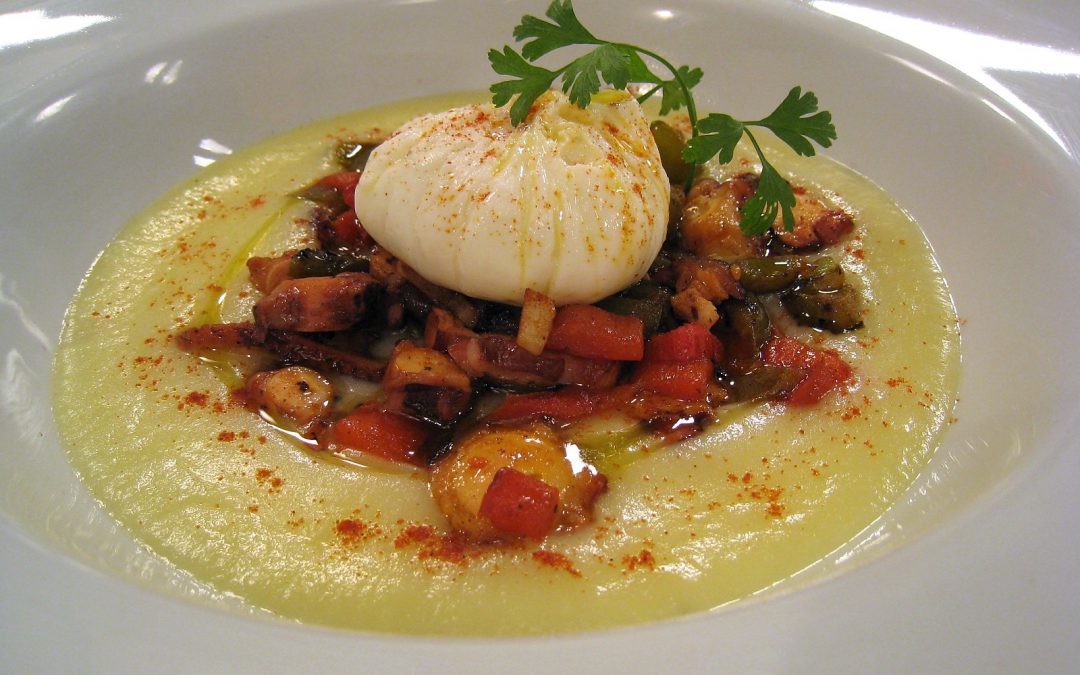 Haremos una sencilla crema de patata comenzando a sofreír en una cacerola con virgen extra la cebolla y el blanco del puerro troceados. Agregar las patatas peladas y cortadas en trozos pequeños y sofreír unos minutos. Cubrir con el agua necesaria, salpimentar y dejar cocer hasta que la patata esté tierna. Como guarnición comenzaremos a saltear en una sartén con un poco de aceite los pimientos cortados en dados, los dientes de ajo filetados y los tentáculos troceados del pulpo. Salpimentar y mantener al fuego unos minutos para que se cocinen bien el pulpo y los pimientos. Para escalfar los 4 huevos huevo: Disponer plástico film sobre un cuenco pequeño. Engrasar con un poco de aceite de oliva y cascar el huevo encima, vigilando que no se parta la yema. Salpimentar y cerrar el plástico como si de un caramelo se tratase. Sumergir en agua hirviendo 4 minutos. Triturar las patatas que teníamos cociendo hasta obtener una crema bien fina. Presentar la crema de patatas con las verduras encima. Cortar el plástico del huevo escalfado con unas tijeras y disponerlo sobre las verduras. Terminar el plato con un poco de pimentón dulce y un chorrito de virgen extra.