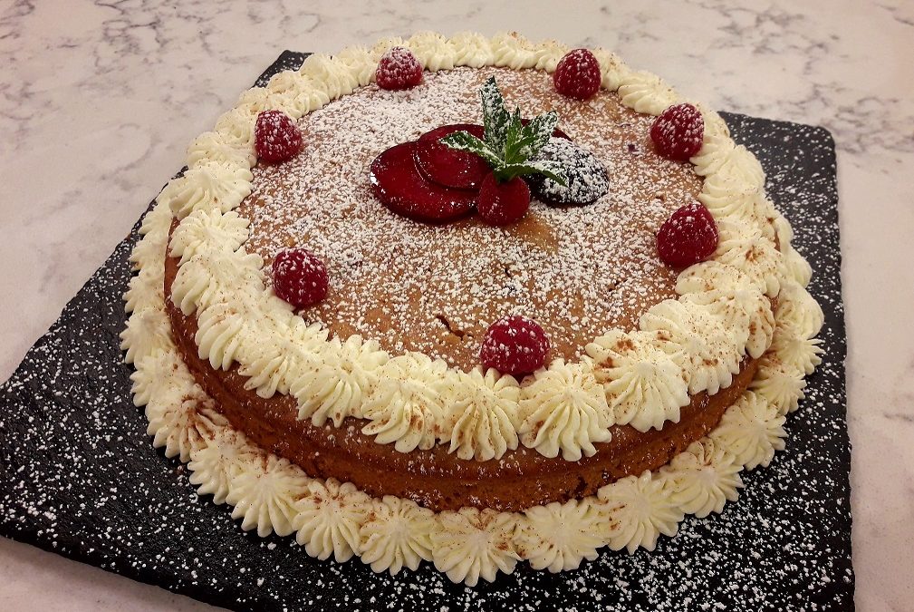 En primer lugar deshuesar las ciruelas y trocearlas en dados. Comenzar entonces a saltearlas en una sartén con 2 cucharadas de virgen extra. Cuando comiencen a coger algo de color, le verteremos el medio vaso de vino dulce y dejaremos que se evapore a fuego alto; reservando las ciruelas para después. Para la masa de la tarta dispondremos la mantequilla en un cuenco y la trabajaremos con la cuchara para que se vuelva cremosa. Incorporar entonces 1 huevo, las nueces peladas y el vaso de leche; sin parar de remover. Añadir la harina, 1/2 cucharada de canela molida, el azúcar y la levadura. Una vez que las ciruelas reservadas haya perdido algo de temperatura las mezclaremos con la masa de la tarta. Engrasaremos un molde con aceite y harina, cubriendo la base con papel vegetal, y verteremos la masa. Repartiremos bien la masa en el molde y cocinaremos durante 45 minutos en el horno precalentado a 180º. Para la crema de queso pondremos en un cuenco el queso crema y 4 cucharadas de azúcar. Mezclar muy bien con la varilla, disponer en una manga pastelera y guardar al frío.