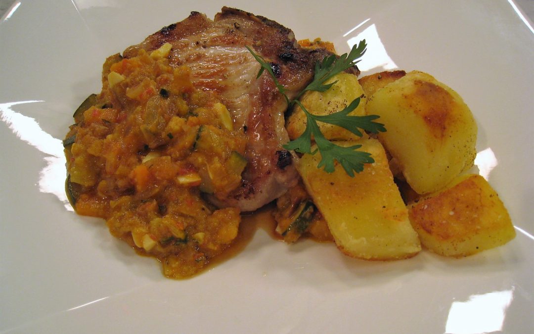 Para la guarnición: pelar las patatas y cortarlas en gajos generosos. Comenzar a cocerlas en una cacerola cubiertas con agua y un pellizco de sal. Dejaremos hervir 5 minutos. Apartar y escurrir. Freir las patatas escurridas en virgen extra hasta que doren. Freír las rebanadas de pan y los ajos enteros en una cacerola con un chorrito de aceite de oliva virgen extra. Apartar y reservar. Comenzar a dorar en la cacerola anterior las cebollas, las zanahorias y el calabacín picados. Dejamos sofreír unos minutos. Retirar los tallos a los tomates, trocearlos un poco y batirlos bien. Verter el tomate triturado en la cacerola y dejaremos sofreír unos minutos. Para terminar la salsa, dispondremos en un mortero sal, pimienta y los dientes de ajo fritos que teníamos reservado. Majar bien hasta formar una masa e incorporar las almendras. Continuar majando y añadir el pan frito, el perejil picado, el azafrán en hebras, un pizca de comino y las yemas de huevos. Desleír con el vaso de vino blanco y verter sobre las verduras que tenemos en la cacerola. Agregar las claras de los huevos picadas, un poco de agua para obtener la consistencia de la salsa deseada y dejamos hervir 10 minutos a fuego medio. Tan solo nos restará apartar las patatas en un plato con papel de cocina para que escurran y salpimentarlas. Y en la misma sartén de las patatas, agregar un poco de virgen extra y cocinar las chuletas de cerdo; salpimentándolas siempre por el lado ya cocinado. Servir las chuletas con patatas y la salsa de verduras por encima de la carne.