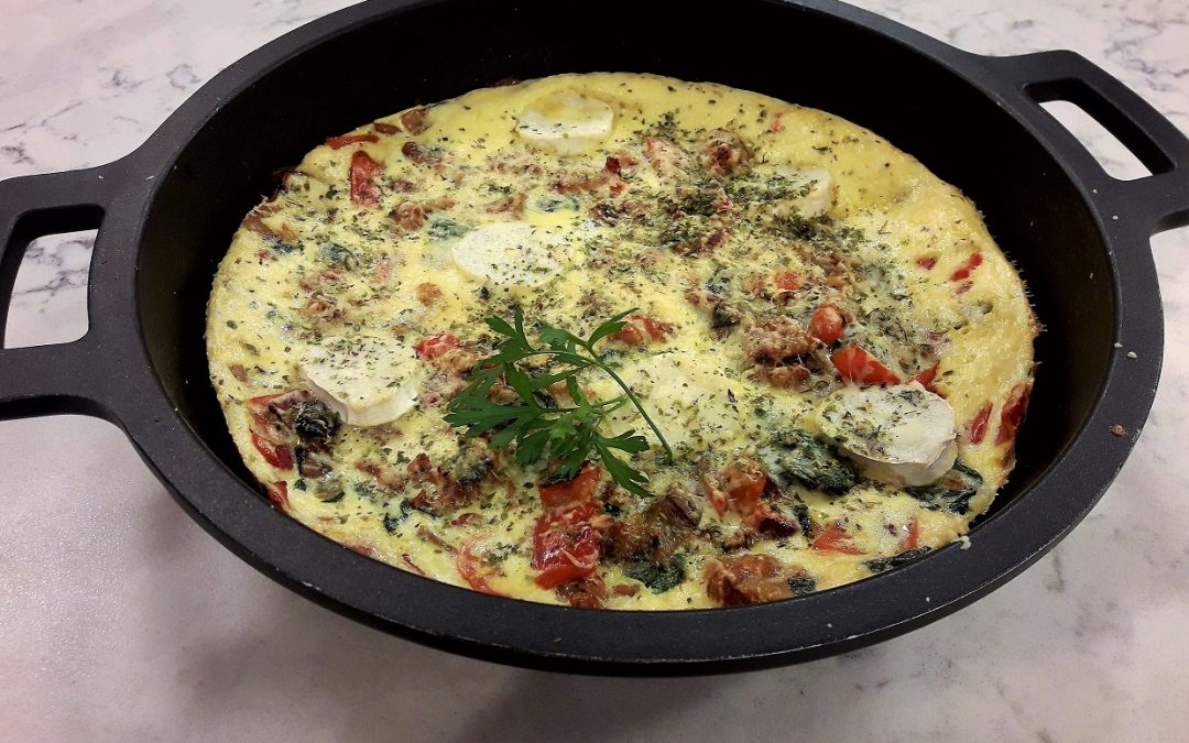 Picar la cebolleta en juliana y comenzar a rehogarla en una sartén con un chorrito de virgen extra. Agregar los dientes de ajo fileteados y el bacon cortado en pequeñas porciones. Sofreír unos minutos e incorporar el pimiento rojo, las setas y la berenjena; todo cortado en trozos no muy grandes. Picar el chorizo criollo e incorporarlo a la cacerola de las verduras junto con las hojas limpias y picadas de las espinacas y los tomates cherry. Dejaremos cocinar 3 minutos a fuego medio. Batir los huevos en cuenco y añadir un poco de queso rallado, sal y pimienta. Repartir el queso de cabra cortado en dados grandes sobre las verduras y verter, poco a poco, los huevos batidos encima. Remover con suavidad, rallar abundante queso por encima y espolvorear con orégano. Hornear durante 10 minutos aproximadamente en el horno precalentado a 200º. Sacar del horno, dejar reposar 5 minutos. Servir en la propia cacerola o bien desmoldarlo.