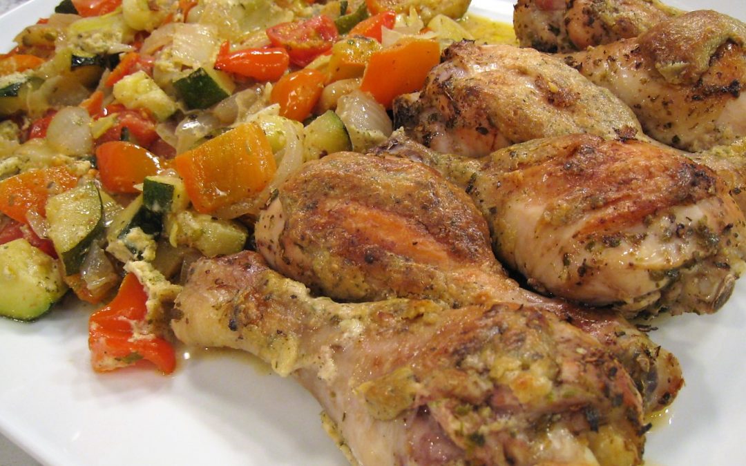 Mezclar los muslitos de pollo con el jugo de 1 limón, orégano, sal y pimienta. Disponerlos en una fuente de horno, echar un chorreón de aceite por encima e introducir en el horno precalentado a 210º durante 15 minutos. Pasados los 15 minutos de cocción, abrir el horno y verte la copa de vino por encima de la carne. Dejar que siga cocinando 10 minutos más. Como guarnición comenzaremos a saltear en una sartén con aceite caliente la cebolla, el calabacín, el pimiento rojo y el puerro; todo cortado de forma generosa. Agregar a la sartén los tomates cherry, salpimentar, dejar cocinar brevemente al fuego. y agregar a los muslos de pollo que tenemos en el horno. Dejando cocinar todo 15 minutos más. Por ultimo, terminaremos la receta con un majao. Para ello dispondremos en una jarra 1 diente de ajo, las almendras fritas, el tomillo seco, el jugo de 1/2 limón y un poco de virgen extra. Triturar y verter sobre la carne que tenemos cocinando en el horno. Dejar cocinar 5 minutos más y servir la carne con las verduras.