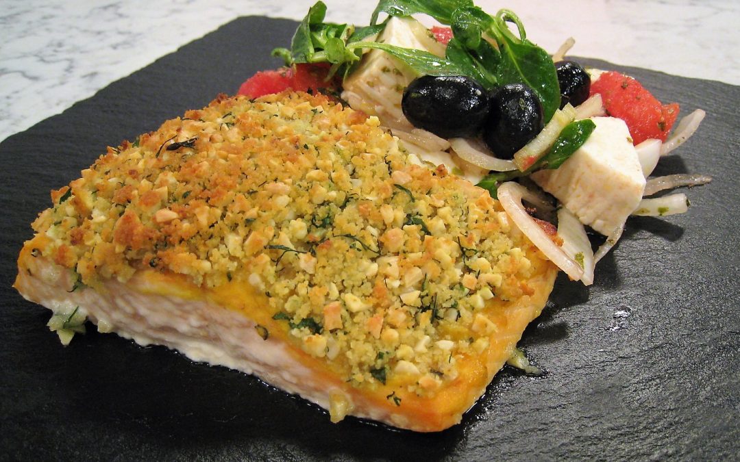 Disponer en un cuenco las almendras, el ajo, el perejil y el eneldo; todo bien picado. Agregar el pan rallado y 2 cucharadas soperas de virgen extra. Mezclar bien hasta conseguir una mezcla uniforme. Colocar las supremas de salmón en una fuente de horno engrasada con aceite. Salpimentar y untar la superficie de cada una con mostaza suave. Cubrir cada porción de salmón con la costra y llevar al horno precalentado a 200º entre 10 y 15 minutos. Para la ensalada añadiremos en un cuenco la sandía y el queso troceados en dados, 1 cebolleta picada, las aceitunas negras, los tomates cherry cortados a la mitad y unas hojas de canónigos. Aliñaremos con un poco de orégano, hierbabuena, sal, pimienta, un chorrito de vinagre y aceite de oliva virgen extra. Mezclar y servir junto con el salmón.