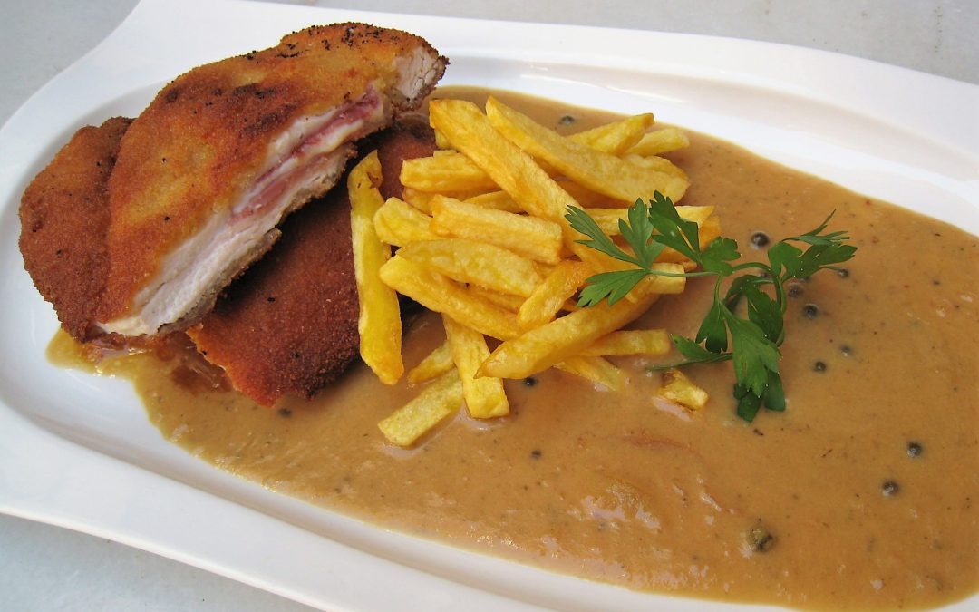 Para la guarnición, cortar 2 cebollas en juliana y comenzar a sofreírla en un sartén con 5 cucharadas de virgen extra. Dejar cocinar, a fuego medio-alto, hasta que vaya cogiendo color. Para los Anetos, disponer 4 filetes de pollo encima de la tabla. Salpimentar y colocar 1 loncha de jamón, 1 loncha de queso y otra loncha de jamón. Cerrar con otro filete de pechuga de pollo y compactar bien. Pasar los Anetos por harina, huevo batido y pan rallado y reservar al frío. Para la salsa a la pimienta, trocear 1 cebolla y comenzar a sofreírla en 2 cucharadas de virgen extra junto con unos granos de pimienta verde. Verter un poco de brandy, flambear y, cuando se apague la llama, agregar la nata. Nada más que comience a hervir, añadir el caldo de carne, salar y dejar cocer, 5 minutos, a fuego medio. Triturar entonces, colar y reservar. Para terminar las cebollas caramelizadas, solo hay que agregar el medio vaso de vino blanco, salar ligeramente y dejar al fuego hasta que evapore el líquido. Finalmente, freír las patatas cortadas al gusto y los Anetos en virgen extra.