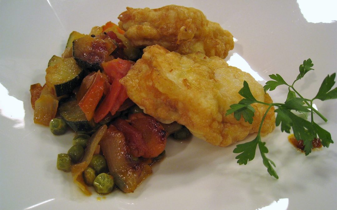 Para la guarnición, picar y comenzar a rehogar, en una sartén con virgen extra, los dientes de ajo, la cebolla, la zanahoria, el pimiento rojo, el calabacín y los tomates. Agregar los guisantes, una hoja de laurel, salpimentar y dejar sofreír, a fuego medio, hasta que la verdura esté bien cocinada. Quitar la espina central al rape, limpiar bien los dos lomos y cortarlos en medallones no muy gruesos. Hacer un pequeño corte e introducir un poco de de jamón ibérico. Compactar bien con las manos, pasar por harina, huevo batido y freír en una sartén con aceite de oliva virgen extra caliente.