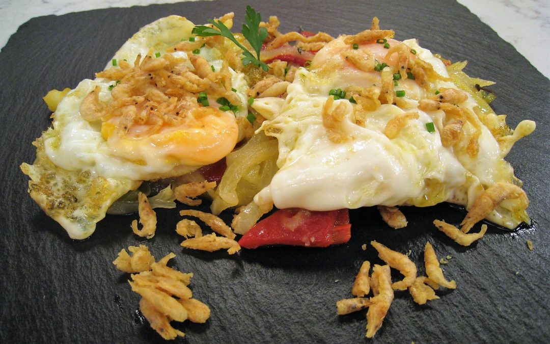 Cortar 1 cebolla en juliana y comenzar a rehogarla en aceite de oliva virgen extra con el pimiento verde cortado en rodajas y los piquillos cortados en cuartos. Agregar 4 dientes de ajo, enteros y golpeados, y 3 patatas peladas y cortadas en finas rodajas. Cocinar unos minutos a fuego medio. Incorporar unas ramas de tomillo, salpimentar y verter la copa de vino. Dejar que hierva y evapore el alcohol del vino. Cubrir con 1 vaso de caldo, tapar casi al completo y dejar cocinar a fuego medio hasta que la patata esté cocida. Para hacer los camarones crujientes los salaremos, los enharinaremos y los freiremos en aceite de oliva virgen extra bien caliente. Apartarlos cuando estén bien crujientes y dejarlos sobre papel de cocina para que pierdan el exceso de aceite. Para los huevos fritos echaremos en una sartén un dedo de aceite y 1 diente de ajo entero y un poco aplastado. Cuando veamos que el ajo comienza a freírse, añadiremos el huevo y lo freiremos al punto de cocción deseado por cada uno. Picar el cebollino. Para emplatar dispondremos las patatas panaderas en la base, 2 huevos fritos encima, un poco de sal y terminaremos en plato con camarones fritos y cebollino picado.