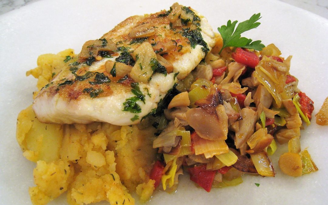 Disponer las patatas en una cacerola con agua y sal. Llevar al fuego y dejar cocer hasta que estén tiernas. Para la guarnición, picar y comenzar a sofreír la cebolla, el puerro, las setas y los pimientos del piquillo. Salpimentar y dejar cocinar, 15 minutos, a fuego medio-alto. Pelar las patatas cocidas, disponerlas en un cuenco y aplastarlas con un tenedor. Verter un chorreón de virgen extra, una pizca de pimentón dulce, tomillo, sal y pimienta. Mezclar y reservar cubierto con plástico. Por otro lado, limpiar el pescado y sacar porciones de cada lomo. Salpimentar y dorar, en una sartén con un poco de aceite, cocinando primero por el lado de la piel. Para la salsa de ajillo, filetear 4 dientes de ajo y comenzar a dorarlos en una sartén con 6 cucharadas de aceite de oliva virgen extra. Nada más que comiencen a dorarse, añadir una guindilla. Retirar del fuego e incorporar abundante perejil picado. Verter entonces sobre una sartén fría con 3 cucharadas de vinagre, moviendo constantemente para que se mezclen bien los ingredientes.