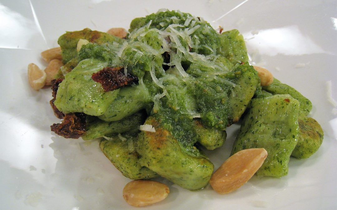 Poner las patatas a cocer en agua con sal. Para el pesto, disponer en una jarra 1 manojo de hojas de albahaca, 1 diente de ajo, las almendras fritas, sal y pimienta. Añadir 1/2 vaso de aceite de oliva virgen extra y triturar bien. Verter en un cuenco, añadir el queso rallado, mezclar y reservar. Pelar y pasar las patatas por el pasapurés. Por otro lado, sumergir durante unos segundos las hojas de espinacas en agua hirviendo, apartarlas y enfriarlas en agua con hielo. Escurrirlas y triturarlas con la batidora junto con el huevo. Añadir al puré de patatas, incorporar un par de cucharadas de queso rallado y mezclar bien. Salpimentar y agregar harina, poco a poco, hasta obtener una textura buena para amasar con las manos. Dividir la masa en pequeños cilindros de unos 2 cm. de diámetro y cortar porciones de unos 2 cm. de ancho. Rematar cada ñoqui con un leve golpe sobre las púas de un tenedor. Verter los ñoquis dentro de agua hirviendo con sal. Cuando suban a la superficie, esperar un minuto y sacar. Por otro lado, filetear 3 dientes de ajo y comenzar a dorarlos al fuego con un poco de virgen extra. Agregar los ñoquis cocidos y el tomate seco cortado en pequeñas tiras. Saltear 2-3 minutos.