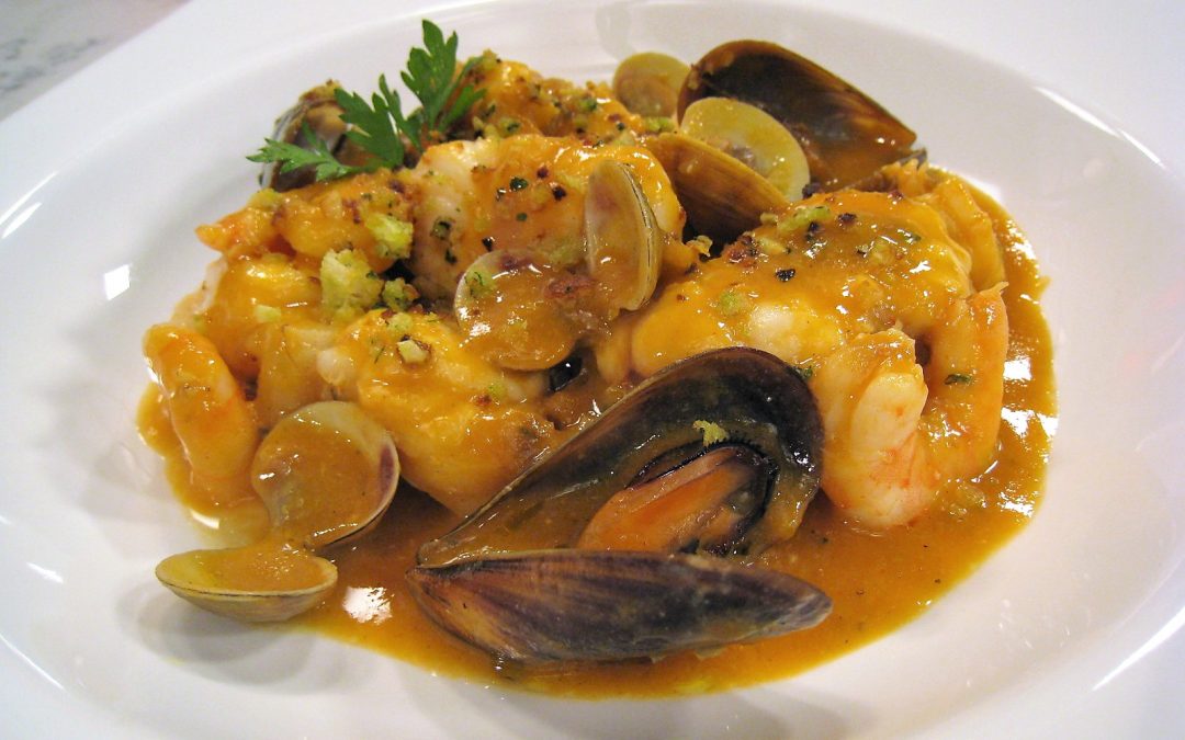 Dorar las cáscaras y cabezas de los langostinos en una cacerola con un poco de virgen extra. Trocear y añadir el puerro, la cebolla y las zanahorias. Sofreír unos minutos y verter el brandy. Flambear y, cuando se apague la llama, agregar pimentón dulce y la salsa de tomate. Cubrir con agua y dejar hervir 15 minutos. Probar de sal la sopa, agregar el arroz y dejar cocer 20 minutos. -Mientras tanto, disponer en un robot de cocina o en el mortero 2 rebanadas generosas de pan, 2 dientes de ajo, las almendras crudas, unas cuantas hojas de perejil, sal y pimienta. Triturar bien y llevar al fuego en una sartén con un poco de aceite. Por otro lado, dorar el calamar troceado en una cacerola con unas cucharadas de virgen extra. Incorporar las almejas y los mejillones junto con un chorrito de vino blanco. Dejar a fuego fuerte hasta que reduzca el vino y se abran las almejas y mejillones. Pasado los 20 minutos de cocción del arroz, batir bien.