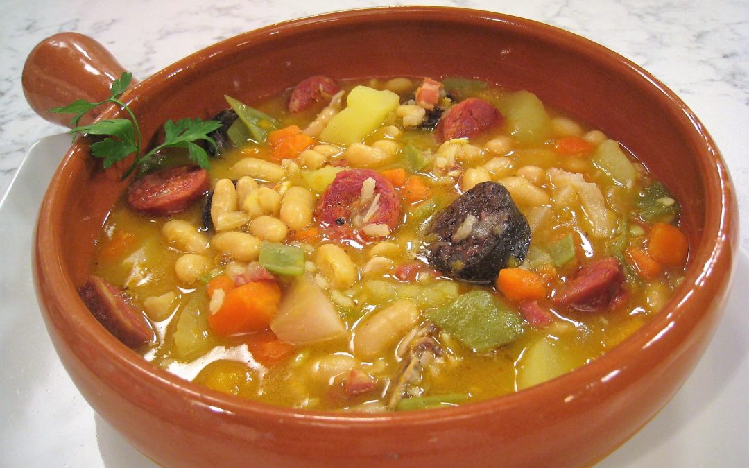 Picar y comenzar a freír, en una cacerola con virgen extra, la cebolla, los dientes de ajo, las zanahorias y el jamón. Añadir unas hebras de azafrán y 2 hojas de laurel. Dejar rehogar unos minutos. Cuando la verdura esté bien rehogada, cubrir con agua y añadir el muslo de pollo, el chorizo, la morcilla, el tocino y 2 clavos. Incorporar las alubias blancas que hemos tenido la víspera en remojo y dejar que comience a hervir. Mientras tanto, limpiar las judías verdes, retirando las hebras laterales y las puntas. Cortarlas en pequeñas porciones y agregarlas a la cacerola junto con la calabaza y las patatas partidas en trozos generosos. Cuando las alubias estén en su punto, probar de sal y agregar el arroz. Dejar que se cueza a fuego medio. Por último, sacar el muslo de pollo, el tocino y el chorizo. Retirar los huesos, trocear y devolver al guiso.