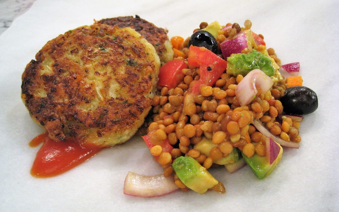 Trocear la coliflor, disponerla en un cuenco, cubrir con plástico y cocinar en el microondas, 12 minutos, a máxima potencia. Para la ensalada de lentejas, verter en otro cuenco un chorreón generoso de aceite de oliva virgen extra, la cuarta parte de vinagre, sal y pimienta. Mezclar bien y agregar el tomate, la cebolla morada y la zanahoria, todo bien picado. Añadir las aceitunas negras, el aguacate troceado y las lentejas escurridas. Mezclar y reservar. Picar la coliflor, devolverla al cuenco y añadir la cebolla, los ajos y el perejil, también muy picados. Incorporar 250 g. de harina, 1 huevo, sal y pimienta. Mezclar bien y dejar enfriar. Hacer entonces pequeñas tortas con la masa e introducir en el interior un trozo de queso. Enharinar y freír, en una sartén con virgen extra, hasta que dore por ambos lados.