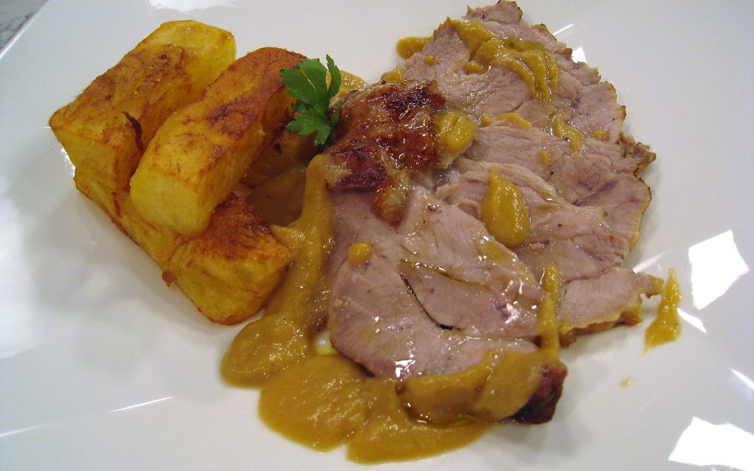 Bridar bien la cabeza de lomo para que mantenga la forma. Salpimentarla bien, espolvorearla con tomillo seco y dorarla en una sartén con unas cucharadas de aceite de oliva virgen extra. Apartar en una fuente de horno. En la sartén anterior, comenzar a sofreír la manzana pelada, los dientes de ajo, la cebolla, el blanco del puerro, la zanahoria y la penca de apio, todo cortado en dados. Dejar sofreír brevemente y volcar en la fuente donde tenemos apartada la carne. Verter medio vaso de vino blanco y 1 vaso de caldo de carne. Exprimir el zumo de 1 limón por encima de la carne, agregar un par de hojas de laurel y llevar al horno, precalentado a 185ºC, durante 1 hora aprox. -Cortar bastones rectangulares y grandes de patata pelada, obteniendo así las famosas patatas puente nuevo. Disponerlas en una sartén, cubrir con aceite y dejar que se cocinen a fuego lento. Por otro lado, picar los recortes de patatas y añadirlos a la fuente del horno. Cuando la carne lleve una hora de cocción, apagar el horno, sacar las verduras, triturarlas para obtener una salsa, y dejar la carne dentro reposando unos minutos. Finalmente, subir el fuego de las patatas puente nuevo para que se doren por fuera y queden bien crujientes.