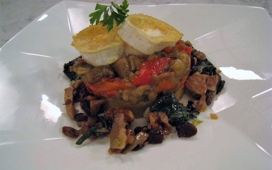 Disponer los pimientos y las berenjenas en una fuente de horno. Salar ligeramente, rociar con un poco de aceite de oliva virgen extra por encima, pinchar las berenjenas y asar en el horno, precalentado a 175º C., entre 35 y 40 minutos. Por otro lado, pelar las patatas, cortarlas en porciones no muy grandes y comenzar a dorarlas en una sartén con unas cucharadas de virgen extra. –Nada más que las patatas hayan cogido algo de color, verter el vaso de caldo de ave y dejar cocinar, a fuego medio, hasta que estén tiernas y haya evaporado el líquido. En otra sartén, comenzar a dorar con un chorreón de virgen extra, los dientes de ajo fileteados, la cebolleta picada, las setas troceadas y las hojas de espinacas. Agregar algunas pasas, algunas nueces y salpimentar. Por otro lado, pelar los pimientos y la berenjena. Cortarlos en tiras y aliñarlos con un poco de sal, pimienta y comino molido. Por último, pasar las patatas tiernas por el pasapuré, salpimentar, regar con un poco de virgen extra y mezclar bien.