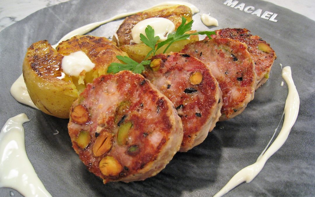 Lavar las patatas de guarnición y disponerlas en una fuente de horno. Salpimentarlas, regar con un chorrito de virgen extra por encima y asarlas en el horno, precalentado a 185ºC., entre 35 y 40 minutos. Para el pollo trufado, picar el jamón, el beicon y la pechuga de pollo y disponer en un cuenco. Añadir la carne de cerdo, los huevos batidos, 3 cucharadas de vino de Málaga, algunas porciones de aceitunas sin hueso, algunos pistachos pelados y la trufa troceada junto con el líquido en el que viene. Salpimentar, añadir un poco de orégano, mezclar y ajustar el espesor con pan rallado si fuera necesario. Extender la masa de carne sobre plástico de cocina y enrollarlo, retorciendo bien los extremos para que quede compacto. Envolverlo con varias capas e introducirlo en agua hirviendo de forma suave durante unos 15 minutos aproximadamente. Sacar entonces, dejar atemperar y guardar al frío. -Por otro lado, cuando las patatas del horno estén tiernas, retirarlas, aplastarlas un poco hasta que se rompan y dorarlas en una sartén con virgen extra bien caliente.