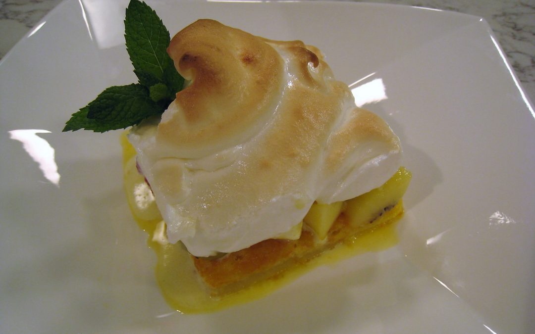 Para el bizcocho, batir con la varilla los huevos y el azúcar hasta que adquieran un color más claro y blanquecino. Añadir entonces la harina tamizada, poco a poco, mezclando con la espátula de abajo hacia arriba con movimientos envolventes. Verter en una fuente de horno engrasada y cubierta con papel vegetal y cocinar, durante unos 15 minutos, en el horno precalentado a 185ºC. Exprimir en un cuenco el zumo de 2 naranjas e ir agregando el resto de la fruta cortada en dados. Para el merengue, disponer un cazo al fuego con 1 taza de azúcar, 1/2 de agua y 1 chorrito de limón. Por otro lado, montar a punto de nieve, con ayuda de la varilla de la batidora, 2 claras de huevo con unas gotas de zumo de limón. Cuando el almíbar comience a tener unas burbujas más pesadas, apartar un poco en un cuenco con agua fría. Dejar enfriar 10 segundos y tomar con las manos esta porción de almíbar, debiendo poder hacer con las yemas de los dedos una bola blanda. Retirar entonces del fuego e ir agregándolo a las claras montadas, sin parar de batir, en forma de hilo fino.