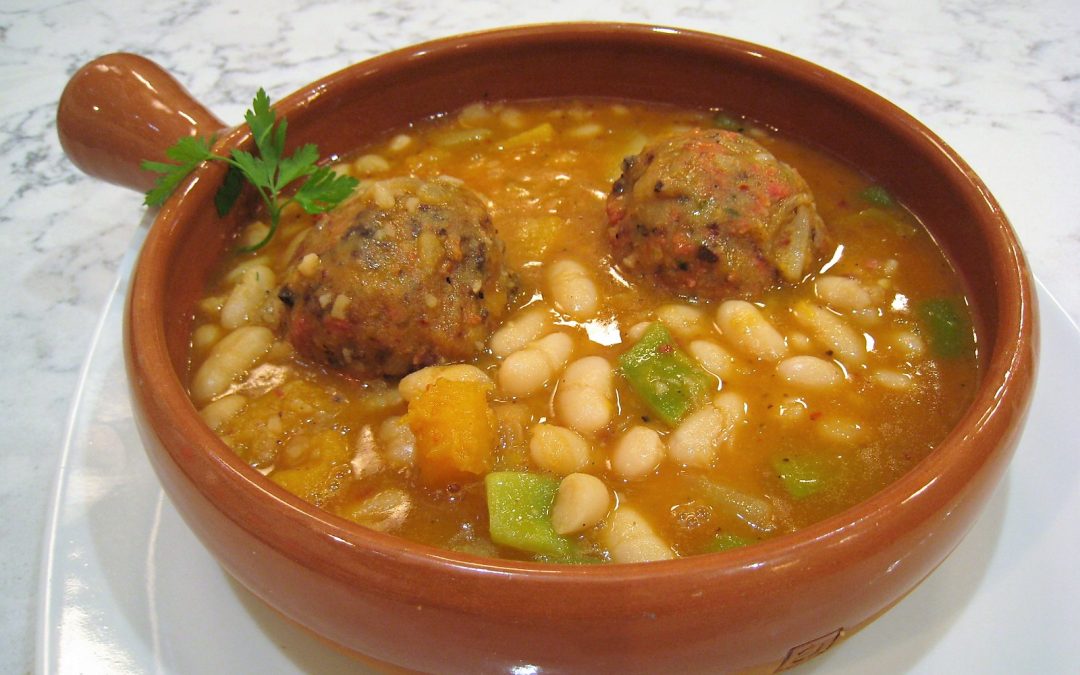 Poner las alubias en remojo la noche antes. Escurrir las alubias y disponerlas en una cacerola cubiertas de agua fría junto con el hueso de jamón, el chorizo, la morcilla y la panceta. Dejar que comiencen a hervir, desespumar y bajar el fuego para que se cuezan lentamente. Por otro lado freír los pimientos choriceros en una sartén con unas cucharadas de virgen extra. Apartarlos en una jarra y reservarlos. Y en el mismo aceite anterior comenzar a sofreír la cebolla picada hasta que esté bien rehogada. Triturar el tomate frito con los pimientos choriceros que teníamos reservados y añadir esta mezcla sobre la cebolla rehogada. Dejar cocinar unos minutos a fuego medio, apagar y reservar. Cuando las alubias empiecen a ablandar, sacaremos el chorizo, la morcilla y la panceta de la cacerola para que enfríen un poco. Por otro lado añadiremos a las alubias que mantenemos al fuego la calabaza y las patatas troceadas junto las judías verdes limpias y cortadas en porciones. Para las bolas picaremos bien la carne apartada y la dispondremos en un cuenco. Agregaremos el jugo de 1/2 limón, una pizca de comino molido, un poco de orégano, 1 huevo, un poco más de la mitad de la cebolla rehogada que teníamos reservada, un pellizco de sal y la harina de maíz. Agregar agua poco a poco, removiendo bien hasta obtener una textura que nos permita hacer pelotas de masa. Engrasar las manos con aceite y hacer pelotas o bolas grandes con la masa anterior. Verter el resto de la cebolla rehogada sobre las alubias e introducir las pelotas en el caldo, dejando que se cocinen unos 15 minutos.