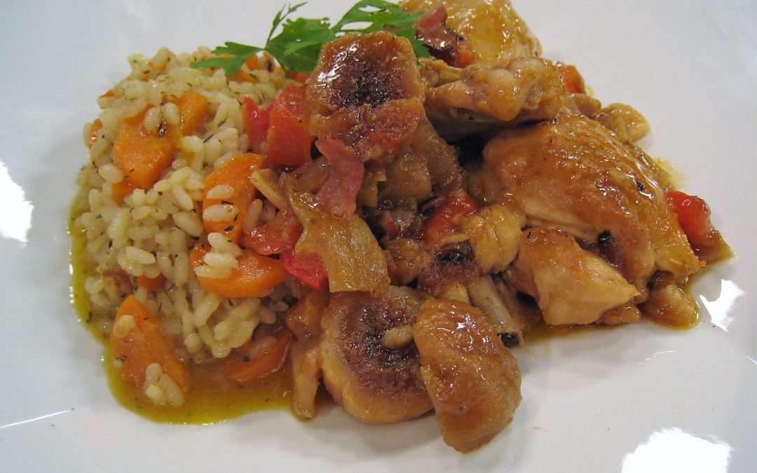 Poner los higos secos en remojo con el vino blanco para que se hidraten. Por otro lado, salpimentar el pollo, enharinar ligeramente y dorarlo en una cacerola con aceite de oliva virgen extra. Apartar y reservar. Picar y añadir, en el aceite anterior, el bacón, 3 dientes de ajo, la cebolla, el pimiento rojo y las setas. Incorporar los tomates picados y dejar sofreír unos minutos. Cuando el tomate esté bien frito, devolver la carne a la cacerola. Añadir el vino, los higos troceados y, cuando evapore el alcohol, verter 3 vasos de agua. Aromatizar con 2 hojas de laurel, probar de sal y dejar cocinar. Como guarnición, dorar 2 dientes de ajo fileteados en una sartén con un poco de aceite de oliva virgen extra. Agregar las zanahorias cortadas en medias rodajas y cocinar unos minutos. Incorporar entonces el vaso de arroz, tomillo seco y cubrir con 2 vasos de caldo de la cacerola. Salpimentar y dejar cocinar, a fuego medio, hasta que haya evaporado el líquido y el arroz esté en su punto de cocción.