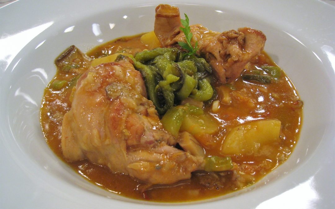 Disponer los pimientos en una fuente de horno, engrasados con aceite y espolvoreados con un poco de sal. Cocinar en el horno precalentado a 180º durante 35 minutos. Comenzar a dorar en una cacerola con aceite de oliva virgen extra la carne troceada y salpimentada. Agregar los dientes de ajo picados. Dejar que doren un poco y añadir los tomates pelados y cortados en daditos, el pimiento seco picado y las setas cortadas en pequeñas porciones. Dejaremos sofreír unos minutos. Pelar las patatas, cortarlas en daditos e incorporarlos a la cacerola junto con las judías verdes limpias de hebras y cortadas en pequeños trozos. Incorporar una cucharada de pimentón dulce y cubrir con agua para evitar que se queme dicho pimentón. Preparar un ligazón disponiendo 4 cucharadas colmadas de harina en un cuenco e ir agregando agua poco a poco hasta conseguir una mezcla cremosa y sin grumos. Agregar este ligazón poco a poco sobre nuestra cacerola, sin parar de remover. Dejaremos que cueza fuego medio unos 20 minutos, hasta que la patata esté tierna y desaparezca el sabor a harina cruda.
