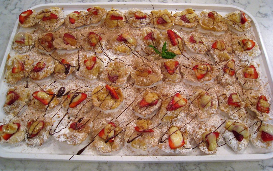 Para las sopaipillas, disponer la harina en un cuenco, abrir un espacio en el centro y verter el agua con sal caliente. Agregar la levadura y 2 cucharadas de aceite de oliva virgen extra. Amasar bien, cubrir con un paño y dejar reposar 30 minutos. Para la crema de vainilla, batir el huevo con el azúcar. Añadir 1/2 vaina de vainilla y la maizena. Mezclar bien hasta que no haya grumos y verter la leche. Llevar al fuego, removiendo de forma constante, hasta que espese. Apartar entonces en un recipiente, cubrir con plástico y dejar enfriar. Cuando la masa haya reposado, y con las manos impregnadas de aceite, sacar pequeñas porciones de masa. Hacer bolas, aplastarlas con el rodillo para que queden finas y freírlas en una sartén con aceite de oliva virgen extra hasta que estén doradas. Apartar sobre papel de cocina y espolvorear azúcar glasé por encima. Por otro lado, derretir la cobertura de chocolate al baño María. Finalmente, mezclar las fresas con las almendras picadas.