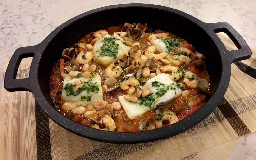 Freír en una sartén con un chorreón generoso de virgen extra las almendras y los dientes de ajo enteros. Apartar y reservar. En el aceite anterior, sofreír la cebolla, los pimientos y la berenjena; todo cortado en pequeños dados. Agregar los tomates triturados, salpimentar y dejar que se vayan friendo. Cuando el tomate esté bien frito añadiremos 1 vaso de vino blanco y dejaremos que se vaya evaporando el alcohol. Y entonces incorporaremos 1 vaso de agua. Limpiar las alcachofas retirando las hojas externas hasta llegar al corazón. Cortar las puntas de las hojas restantes, terminar de limpiar el interior con una cuchara o sacabolas y añadirlas a la cacerola. Dejar cocer 10 minutos a fuego medio-alto. Majar los ajos reservados y pelados en el mortero con un poco de sal. Cuando tengamos una pasta de ajo en el mortero, añadir 5 cucharadas de virgen extra y perejil picado. Mezclar bien. Cuando la cacerola apenas tenga líquido, dispondremos las porciones de bacalao repartidas por encima, las almejas, los cuerpos de las gambas y las almendras. Regar las porciones de pescado con el aceite de ajo y perejil. Cocinar en el horno precalentado a 185º durante 15 minutos aproximadamente.