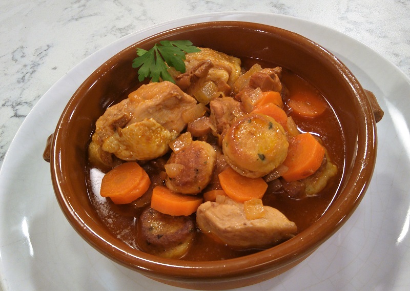 Para el estofado, salpimentar la carne y dorarla en aceite de oliva virgen extra. Picar y agregar una cebolla junto con los ajos laminados, las setas troceadas, las zanahorias cortadas en rodajas, 2 hojas de laurel, dos clavos y una pizca de comino. Agregar el tomate frito y mezclar bien. Verter el vino tinto y dejar reducir. Cubrir la carne solo con el agua necesaria y salpimentar. Dejaremos cocer hasta que la carne esté tierna. Para los buñuelos, remojar la miga de pan en leche. Escurrir bien y mezclarla con los huevos batidos, el perejil y los ajos picados. Salpimentar y ajustar el espesor con el pan rallado. Hacer pequeñas bolas de masa, dorarlas ligeramente en aceite de oliva e incorporar al estofado; cuando la carne esté casi en su punto. Terminar de cocer a fuego bajo durante 10 minutos.