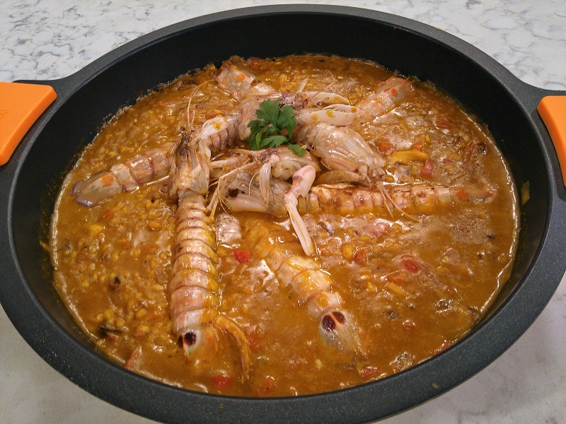 Comenzar friendo en la cacerola o paellera con virgen extra los dientes de ajo sin pelar, las almendras y la ñora limpias. Apartar en una jarra, agregar unas hebras de azafrán, hojas de perejil fresco y un poco de caldo. Triturar bien con la batidora y reservar. En el mismo aceite anterior saltearemos las galeras durante un minuto y a fuego fuerte. Apartar y reservar. Es le turno de las alcachofas. Limpiar las hojas externas hasta llegar al corazón. Cortar las puntas de las hojas restantes, terminar de limpiar el interior con una cuchara o sacabolas, cortar en porciones y añadirlas a la cacerola. Dejaremos sofreír a fuego medio hasta que empiecen a dorar. Agregar el blanco del puerro, el pimiento rojo y los calamares troceados. Dejaremos sofreír unos minutos. Mientras tanto rallar los tomates. Añadirlos y dejar cocinar hasta que el tomate se haya frito. Llegados a este punto incorporar el arroz y el majao reservado. Incorporar 2,5 medidas de caldo por cada medida de arroz, probar de sal sal y dejar cocinar en el fuego durante unos 12 minutos; añadiendo algo de caldo si fuera necesario. Unos 2 minutos antes de terminar la cocción, agregar las galeras y dejar que se terminen de cocinar.