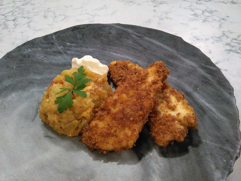 Pelar los langostinos y dorar las cabezas y caparazones en una sartén con un chorreón generoso de virgen extra. Apartar y desecharlos. En el mismo aceite anterior sofreír la cebolla picada junto con el bacon cortado en daditos. Pelar las patatas cocidas, aplastarlas con un tenedor e incorporarlas a la sartén. Cocinar durante unos minutos y agregar la nata y un poco de queso rallado. Añadir los cuerpos de los langostinos troceados, salpimentar y retirar del fuego. Engrasar los moldes o flaneras con aceite y disponer la masa de patatas en el interior de cada uno. Echar queso rallado encima de cada uno y hornear 20 minutos en el horno precalentado a 180º. Por otro lado sacaremos los lomos limpios de las doradas, les retiraremos la piel y las espinas. Romper lo cereales con las manos o ayudándonos del rodillo. Salpimentar los lomos de pescado y pasarlos por harina, huevo batido y por los cereales. Freír en abundante aceite de oliva virgen extra, bien caliente. Apartar sobre papel de cocina. Servir el pescado crujiente con el pastel de patatas y acompañar opcionalmente con un poco de salsa mayonesa.