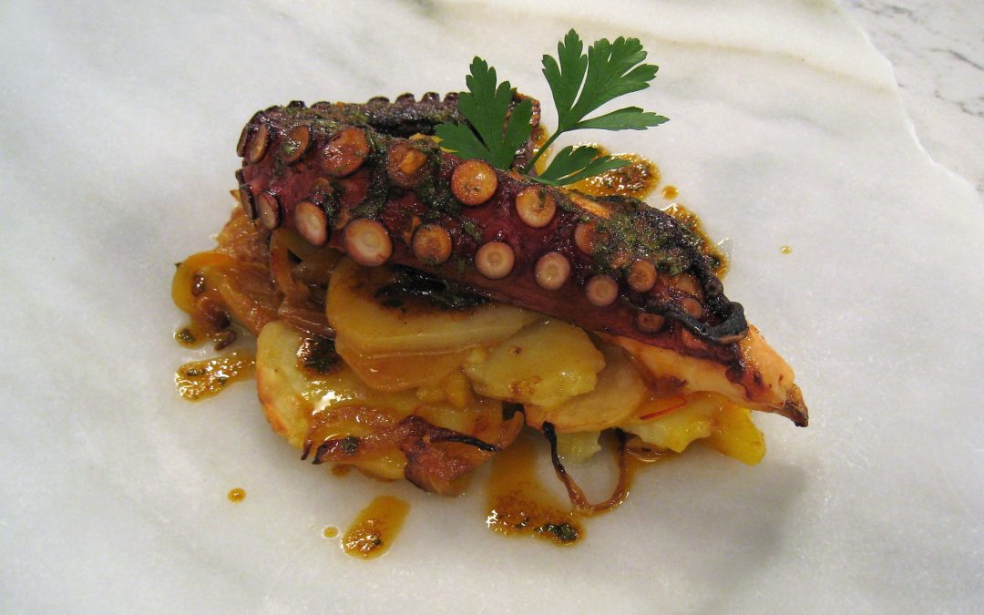Cortar las cebollas en juliana y comenzar a rehogarlas en una sartén con 4 cucharadas de virgen extra, 3 dientes de ajo fileteados y unas hebras de azafrán. Mantener a fuego medio-alto hasta que empiecen a dorarse. Mientras tanto, pelar las patatas, cortarlas en rodajas finas y disponerlas en una fuente de horno engrasada. Salar y rociar un poco de virgen extra. Cuando la cebolla empiece a coger color, agregar 1 cucharada de harina, remover bien y verter el vaso de vino blanco. Mezclar y cocinar unos segundos antes de añadirlo sobre las patatas. Disponer en la fuente los tentáculos de pulpo seco, introducir en el horno, precalentado a 200ºC, y dejar cocinar unos 30 minutos. Para la vinagreta, picar el diente de ajo y dorarlo en una sartén con 5 cucharadas de virgen extra. Retirar del fuego y agregar entonces el perejil picado, media cucharilla de pimentón dulce y unas gotas de vinagre. Remover muy bien para que la mezcla emulsione y reservar.