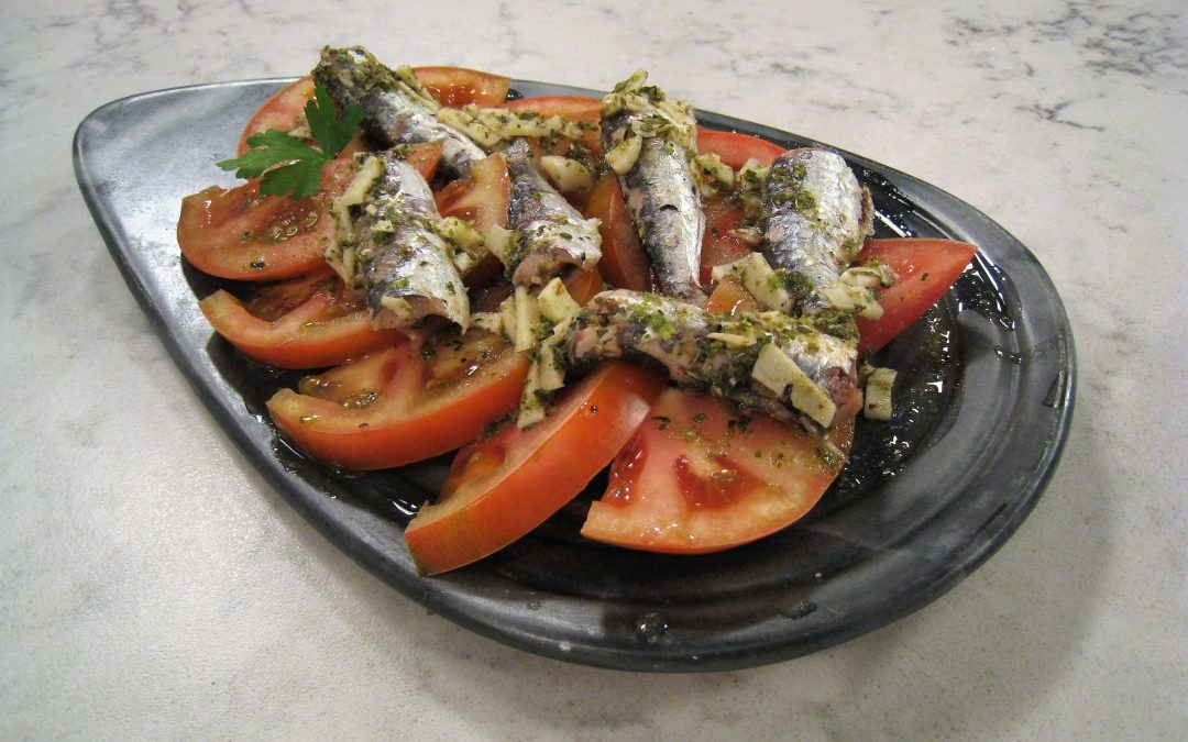 - 1 tomate de ensalada, 1 lata de sardinas en conserva, 1 diente de ajo, comino, orégano, aceite, vinagre y sal