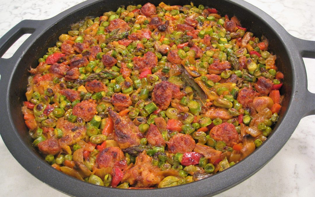 Comenzar a dorar el pollo en una cacerola con unas cucharadas de virgen extra. Salpimentar y agregar la cebolla y el pimiento troceados, los dientes de ajo laminados y 1 hoja de laurel. Incorporar los champiñones cortados en porciones, unas hebras de azafrán y dejar sofreír, a fuego medio-alto, unos minutos. Añadir entonces los tomates rallados y dejar freír. Mientras tanto, desgranar las habas. Agregar al sofrito las habas y los guisantes. Verter el vino blanco y cuando evapore el alcohol, añadir 5 vasos de caldo de ave y dejar que comience a hervir. Añadir entonces 2 vasos de arroz, una pizca de curry y mezclar. Repartir por la superficie el chorizo cortado en rodajas y los espárragos verdes cortados en pequeñas porciones. Llevar al horno, precalentado a 250º C., y cocinar un máximo de 15 minutos.