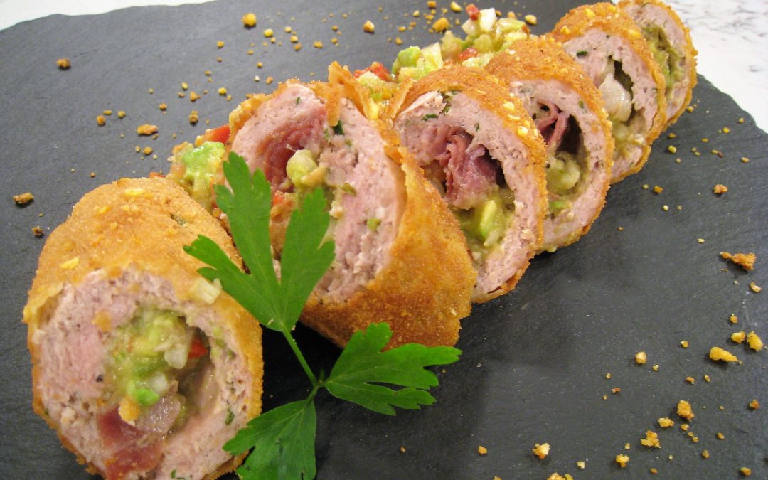 Disponer la carne picada en un recipiente y añadir los dientes de ajo y un poco de cilantro picados. Agregar 1 huevo, una pizca de orégano, comino molido, sal y pimienta. Incorporar un poco de pan rallado, mezclar y reservar al frío unos minutos. Para el aliño de aguacate, picar la cebolleta y el pimiento. Mezclar y añadir el tomate y los aguacates cortados en daditos. Salpimentar, agregar unas gotas de zumo de limón y remover bien. Hacer bolas con la masa de carne picada reservada y colocar cada una entre dos hojas de plástico de cocina. Pasar suavemente el rodillo por encima, retirar el plástico de arriba y disponer una loncha fina de jamón ibérico y un poco de masa de aguacate. Envolver, ayudándonos del plástico, cerrando los extremos como si fuera un caramelo y guardar al frío. Por otro lado, triturar el maíz frito con el rodillo o con la batidora. Quitar entonces el plástico a los flamenquines, pasarlos por harina, huevo batido y un poco de pan rallado mezclado con el maíz frito. Freírlos en una sartén con virgen extra caliente y apartar sobre papel de cocina.