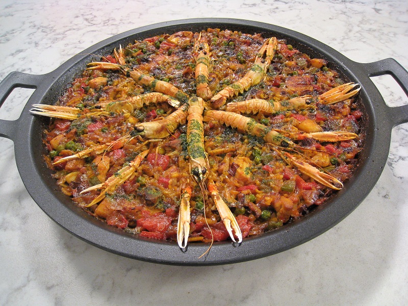 Comenzar a sofreír en la paellera, con un poco de virgen extra, el pollo y la cinta de lomo troceada. Picar y agregar el puerro, el pimiento verde y tres dientes de ajo. Mantener a fuego fuerte y añadir unas hebras de azafrán, 2 hojas de laurel y el choco cortado en daditos. Dejar cocinar unos minutos. Salpimentar el sofrito e incorporar los pimientos morrones cortados en pequeños dados, 1 cucharada de pimentón dulce y, seguidamente, el tomate frito. Cubrir con el litro de caldo de ave y dejar que comience a hervir. Añadir entonces el arroz y los guisantes. Mezclar bien y cocinar unos minutos removiendo de forma continuada los primeros 5 minutos. Por otro lado, triturar 1 diente de ajo con un buen manojo de hojas de perejil fresco y un chorreón de virgen extra. Finalmente, disponer las cigalas sobre el arroz, regar con la picada e introducir en el horno, a 240ºC, hasta que el arroz cumpla los 15 minutos de cocción.