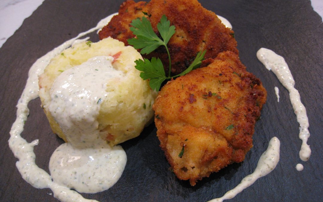 Pelar las patatas y aplastarlas en un cuenco con ayuda de un tenedor. Agregar el bacón picado, la nata, el huevo batido y cebollino picado. Salpimentar y mezclar bien. Engrasar moldes individuales, rellenarlos con la mezcla anterior e introducir un dado de queso en el interior. Llevar al horno, precalentado a 180ºC, durante unos 15 minutos. Para la salsa tártara, mezclar la mayonesa con el yogur y añadir los pepinillos, las alcaparras, un poco de cebolla roja, 1 cucharada de mostaza y algunas hojas de perejil fresco. Triturar bien y reservar. Para los San Jacobos, sacar los lomos limpios del rape, cortar finos medallones y abrirlos en forma de libro. Disponer en el interior un poco de jamón loncheado, cerrar, salpimentar ligeramente y reservar. Finalmente, picar los dientes de ajo y hojas de perejil fresco y mezclarlos con pan rallado. Pasar entonces los medallones de pescado por harina, huevo batido y el pan rallado. Freírlos en una sartén con virgen extra caliente y apartar sobre papel de cocina.