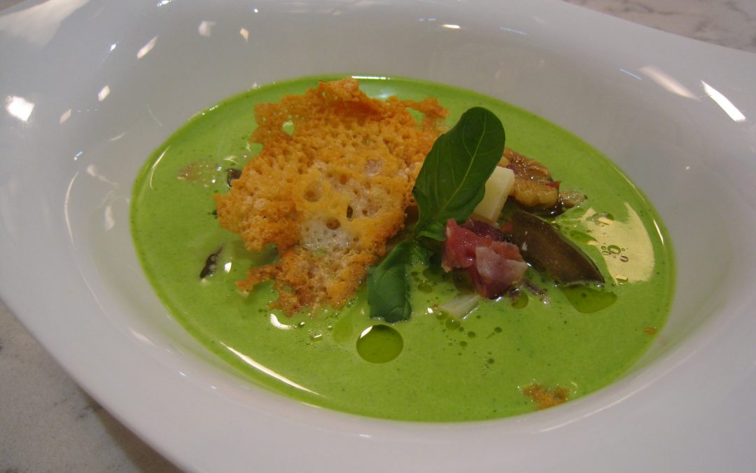 Para el gazpacho verde, trocear y disponer en un cuenco el pepino pelado, el pimiento verde y la penca de apio limpia de hebras. Añadir 2 rebanadas de pan sin corteza, 1 diente de ajo, una cucharada de miel, el yogur, 1/2 vaso de aceite de oliva virgen extra, algunas hojas de albahaca, un poco de perejil y las espinacas. Salpimentar, verter unas gotas de vinagre y triturar bien. Colar el gazpacho, incorporar unos cubitos de hielo y guardarlo al frío cubierto con plástico. Para la guarnición, cortar la mitad del queso en dados y disponerlos en un recipiente. Incorporar el tomate, también cortado en dados, el jamón picado, las nueces, 4 cucharadas de virgen extra, sal y pimienta. Mezclar y reservar. Por último, rallar el resto del queso y cocinar porciones en una sartén antiadherente caliente. Darle la vuelta, dejar que se cocine por el otro lado, apartar sobre papel de cocina y dejar enfriar.